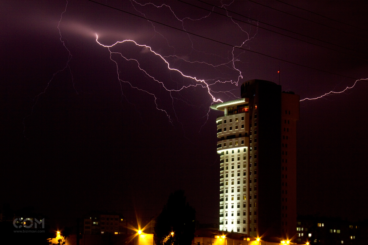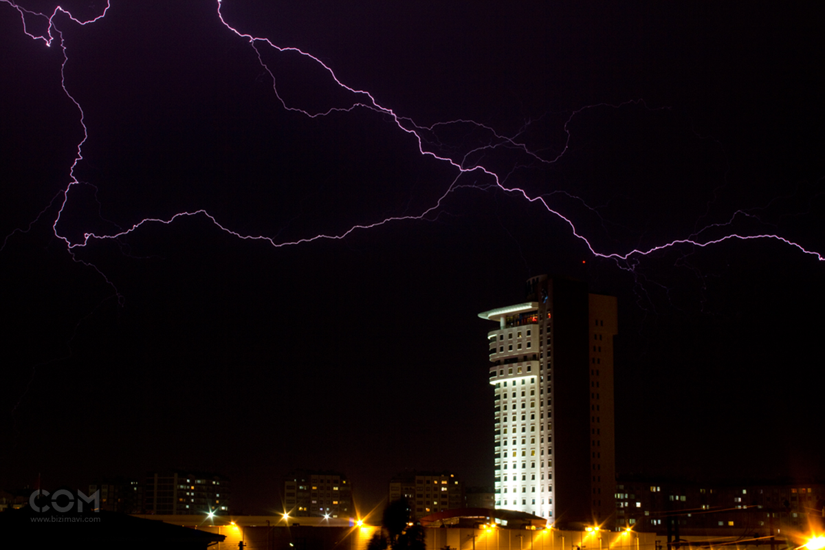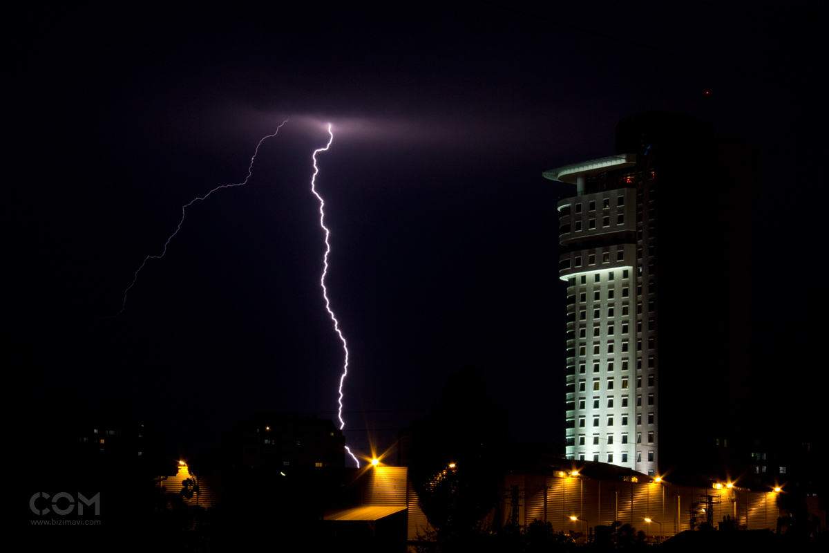 Artık şimşek çekmeye hazırdım. Bu ilk şimşek fotoğrafı çekme denemem olduğu için başta  “şimşek belirli zaman aralığıyla oluşuyor nasılsa” diye düşünüp içimden süre tutmayı denedim. ( işin aslı shutter sayısı artmasın diye cimrilik yapmıştım. Makinenizin her basışta çekim sayısının artması muhabbeti yani, otomobillerde kilometresi çok olunca fiyat düşer ya, makinenizi bir gün satacak olursanız shutter sayısı da fiyatını belirleyen bir faktör ) Süre tutma olayı pek işe yaramamıştı, çünkü şimşekler her ne kadar belirli aralıklarla oluşuyor olsa da ben hep şimşeği gördükten sonra deklanşöre basıyor ve asıl şimşeği kaçırıp artçı bir iki ışıltıyı yakalayabiliyordum. Onun yerine yine zaman aralığını da hesaba katıp şimşeğin oluşmasını tahmin ettiğim süreden önce onar saniye aralıklarla ( on saniyeden fazla sürede dedeman otel üzerindeki ışıklar parlama yapıyordu ) rastgele makinemi pozlamaya başladım.  İşe yaramıştı. İstediğim gibi şimşek fotoğrafı çekebiliyordum artık. Ancak balkondan çektiğim için çerçeveye elektrik tellerinin girmesi canımı sıkmıştı. Çatıya çıkmalıyım dedim.