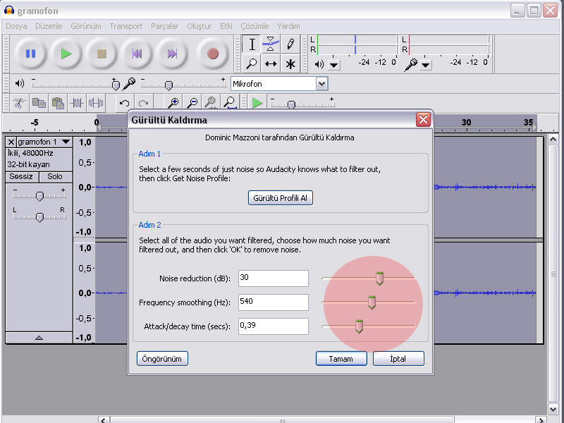 ( Resim ) Fareyi gürültünün belirgin oldugu noktaya getirip gürültü profili al yazan yere tıklıyoruz. ( Resim ) Son olarak etkin hale gelen ayarları sağa veya sola kaydırarak düzenleme yapabiliyoruz. ( Resim )