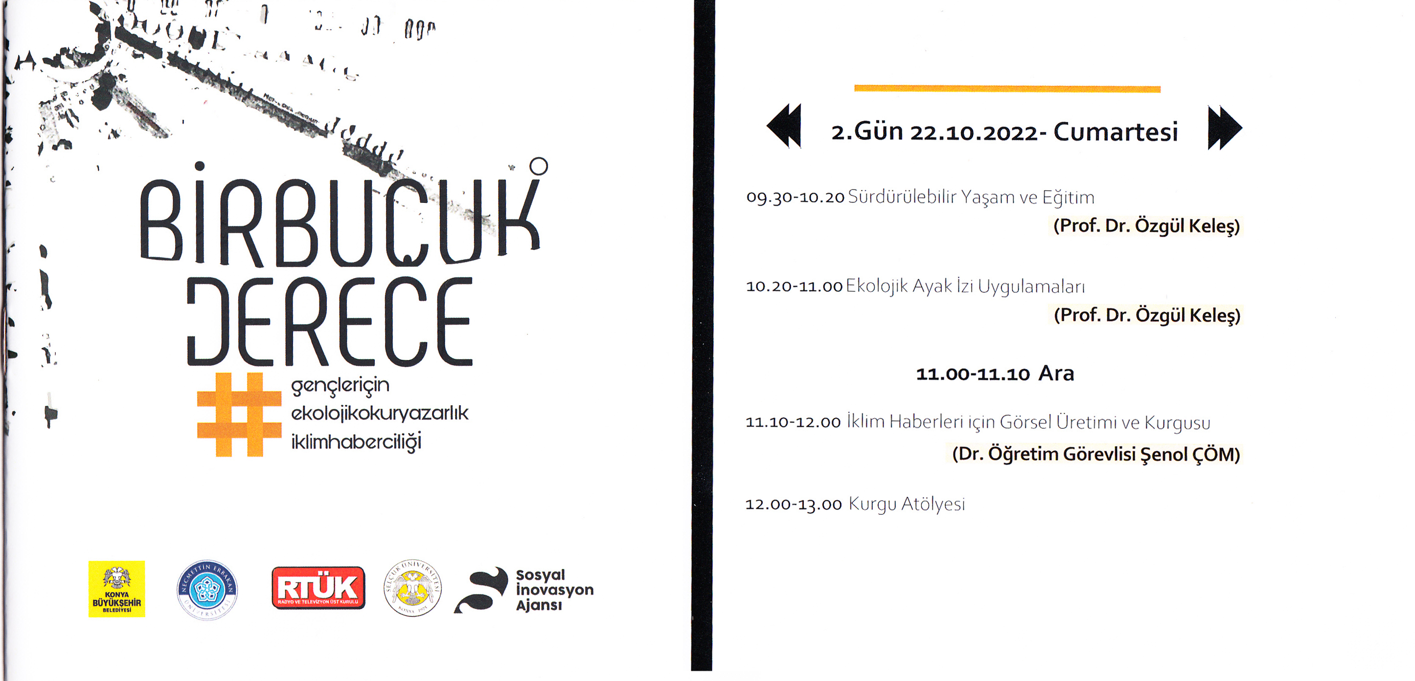 Genç iletişimcilere ekoloji alanında bilimsel bir eğitim ve beceri geliştirme platformu olarak tasarlanan Birbuçuk Derece adlı “Ekolojik ve İklim Haberciliği Eğitimleri” düzenlendi. Etkinlik, RTÜK, Konya Büyükşehir Belediyesi, Necmettin Erbakan Üniversitesi ve Selçuk Üniversitesi iş birliği ile Sosyal İnovasyon Ajansı yürütücülüğünde 21-23 Ekim tarihlerinde Konya Bilim Merkezinde gerçekleşti.