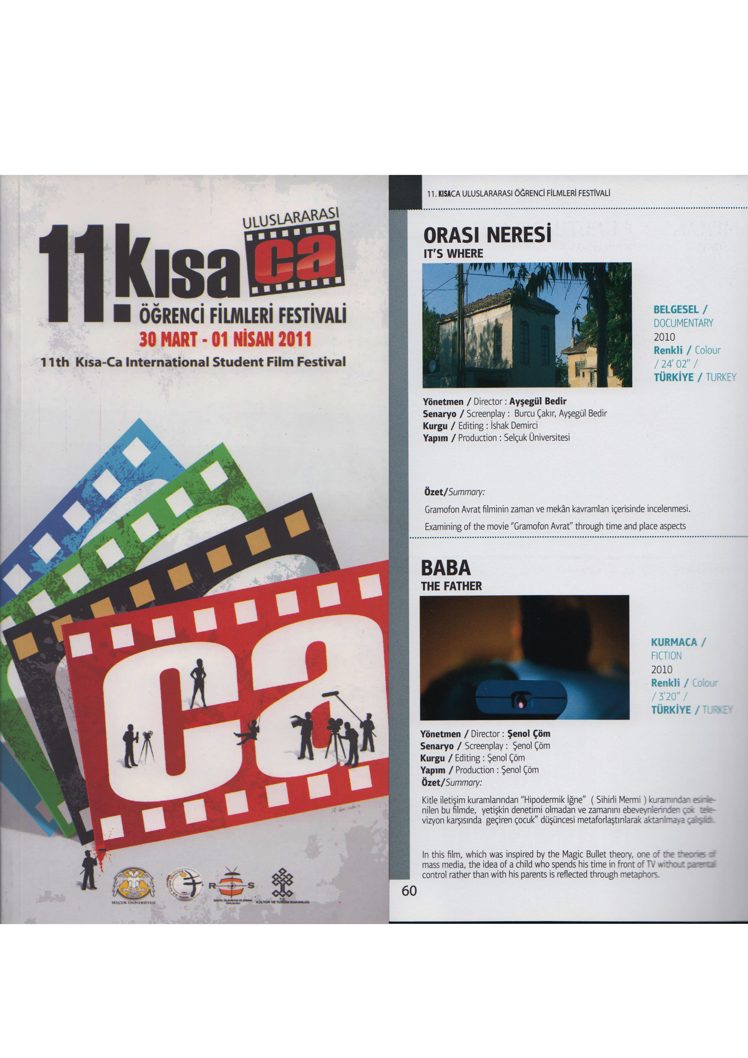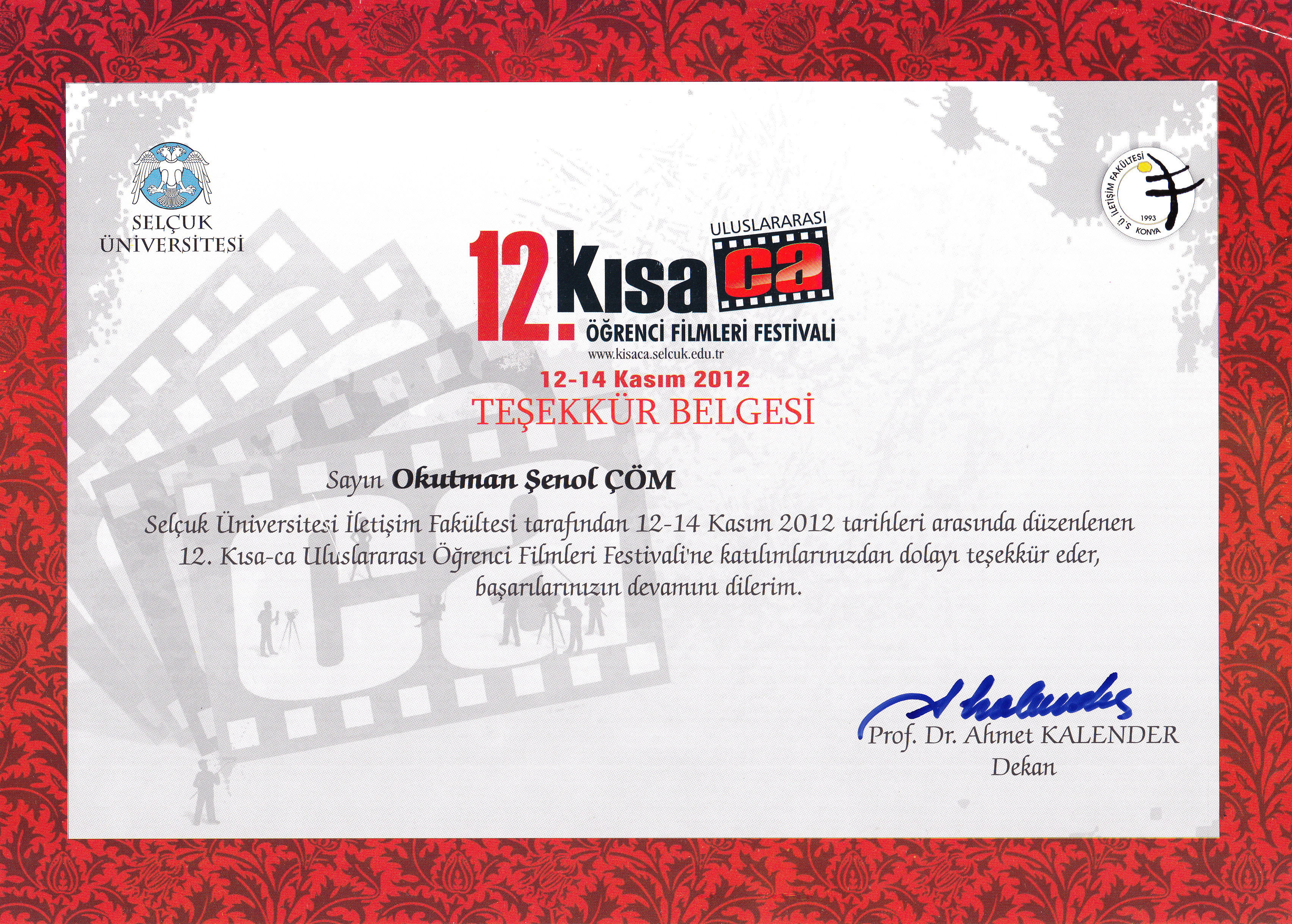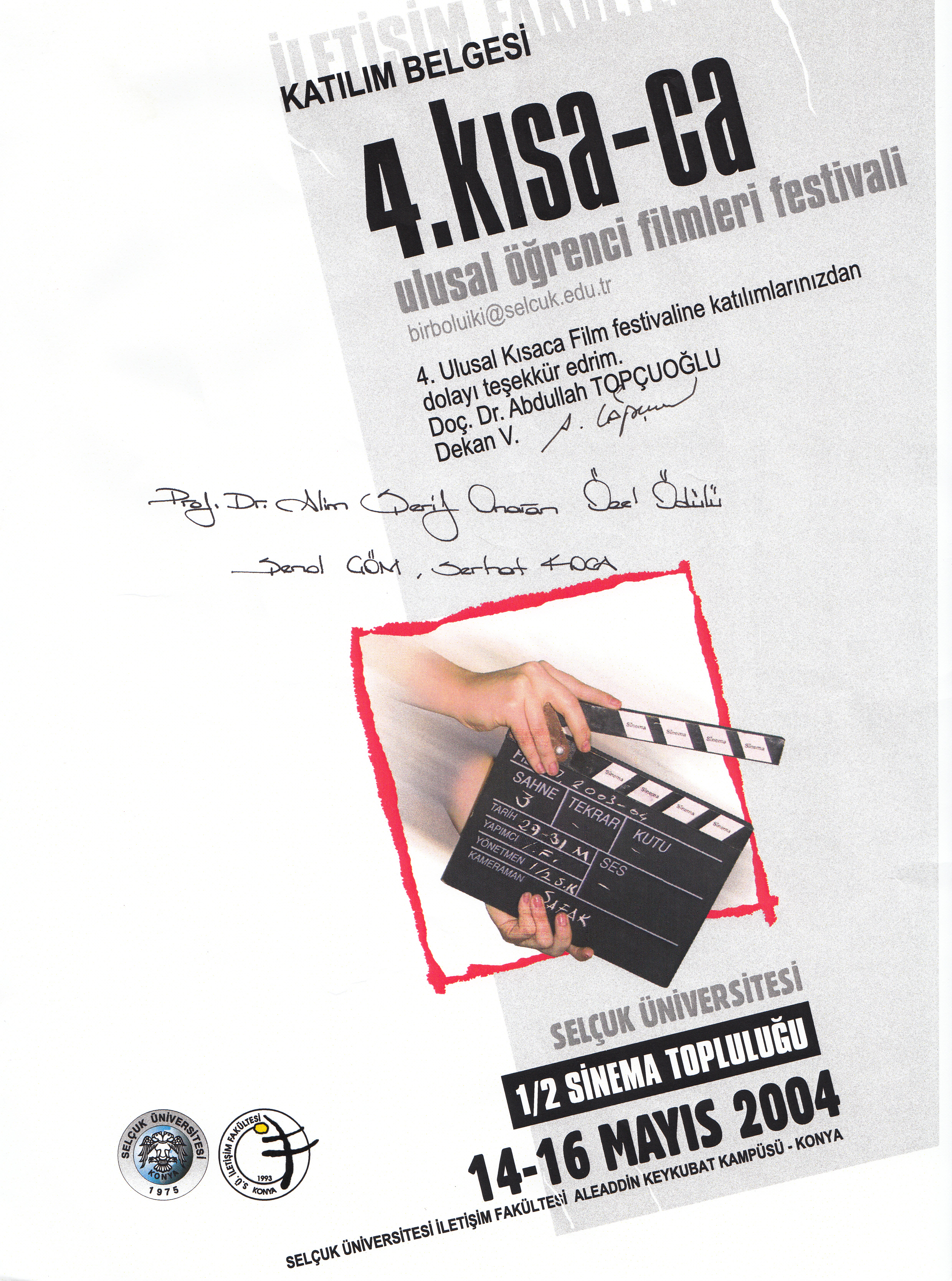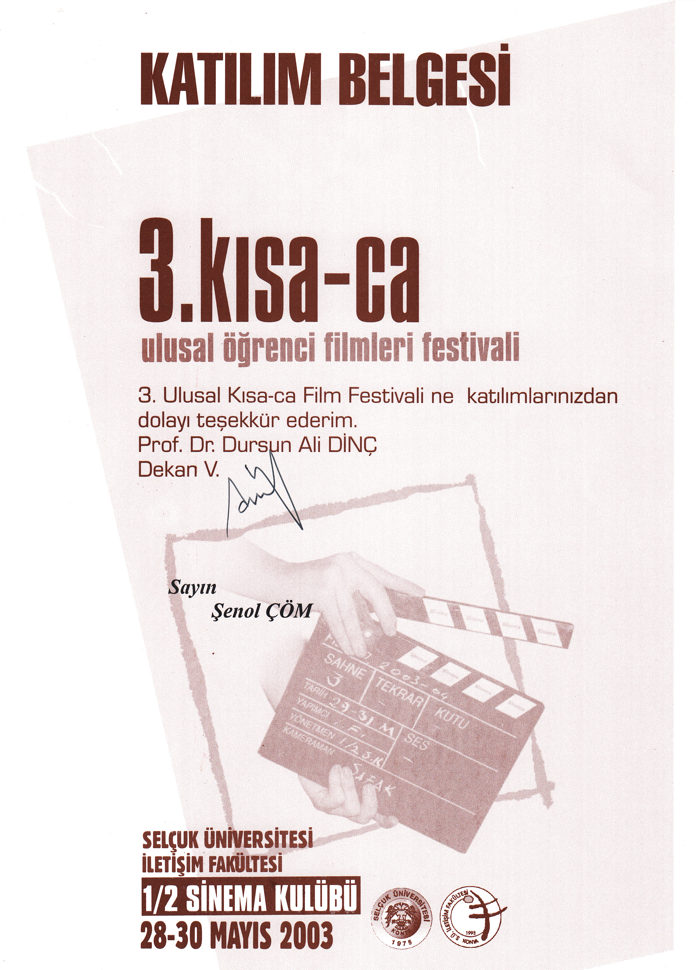 S.Ü. 1. Kısa-ca Film Festivali 3. lük ödülü ( Karar ) (Festival Katalog) (Katılım Belgesi)