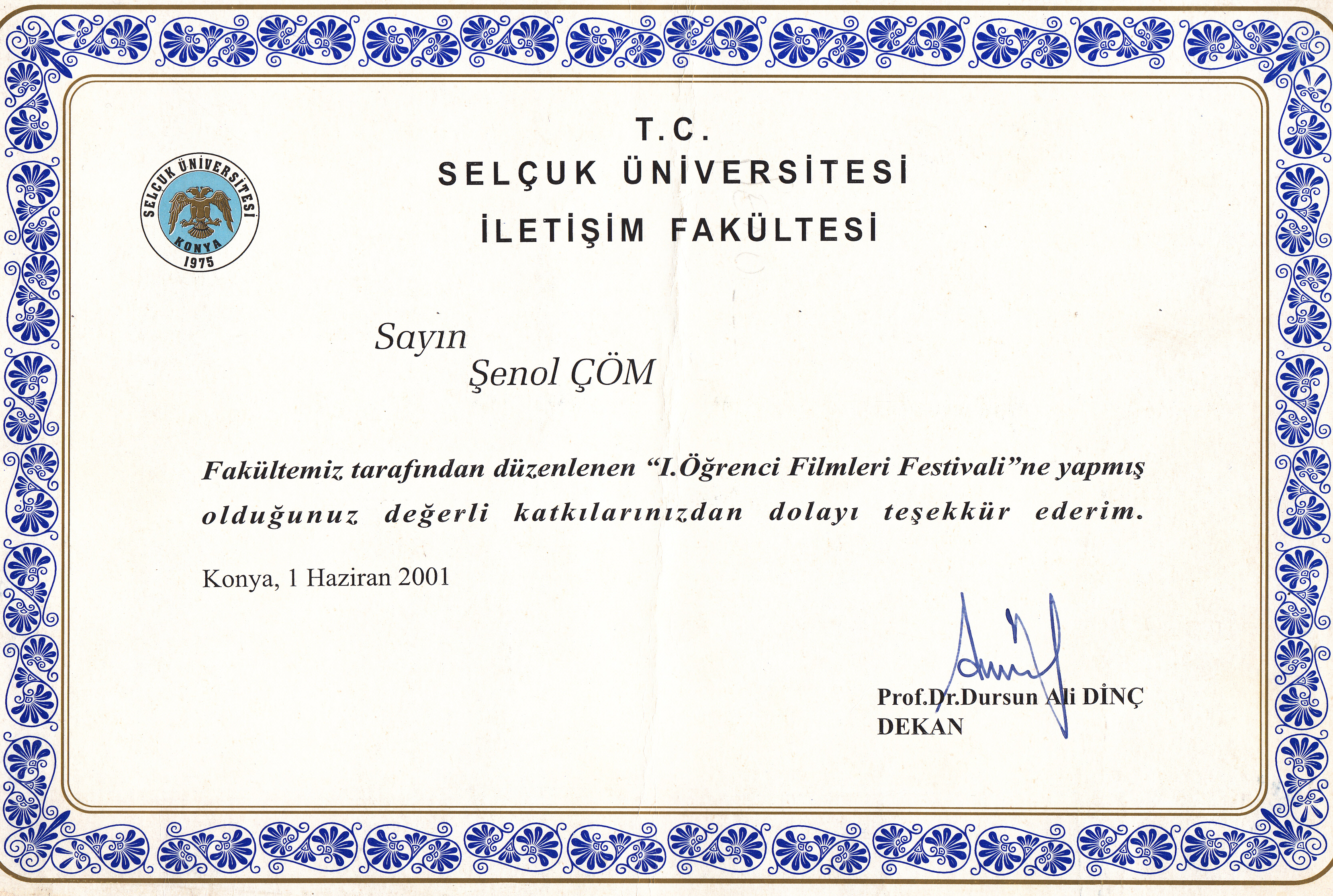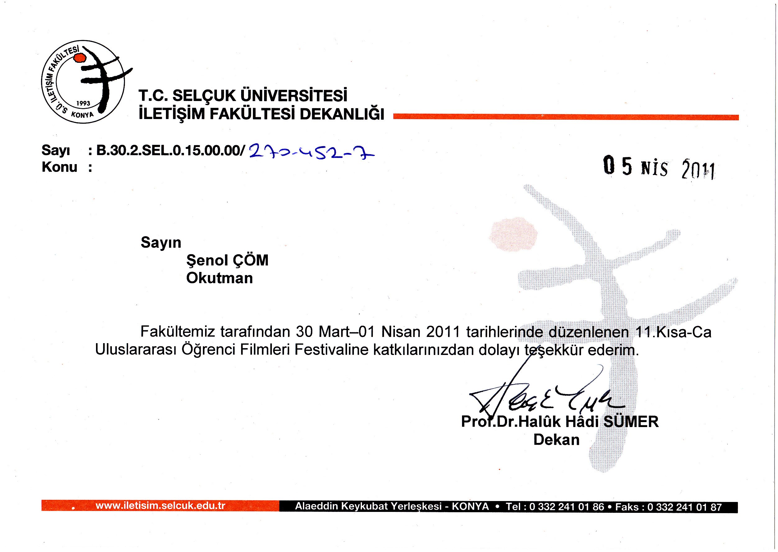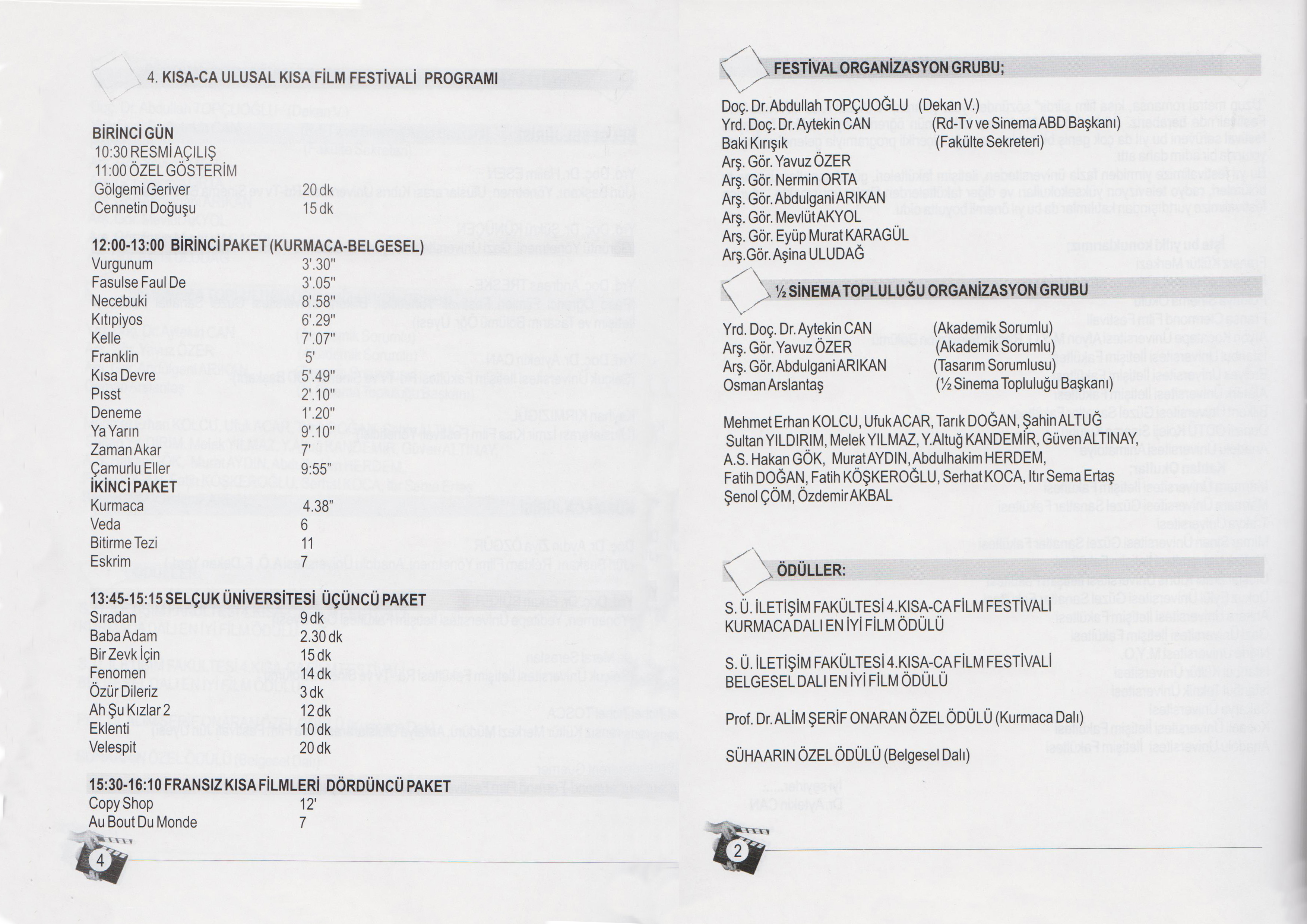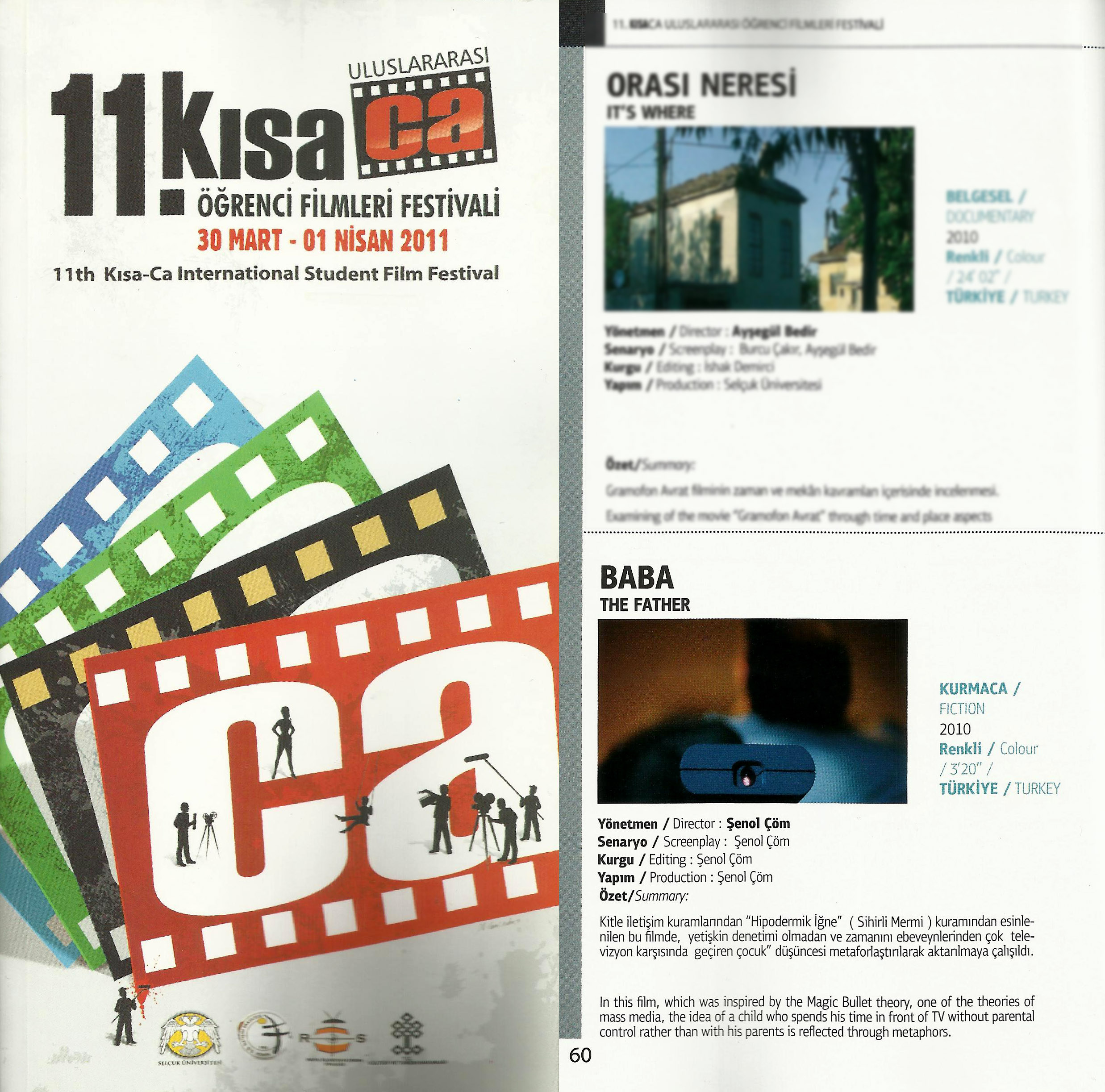 S.Ü. 1. Kısa-ca Film Festivali 3. lük ödülü ( Karar ) (Festival Katalog) (Katılım Belgesi)