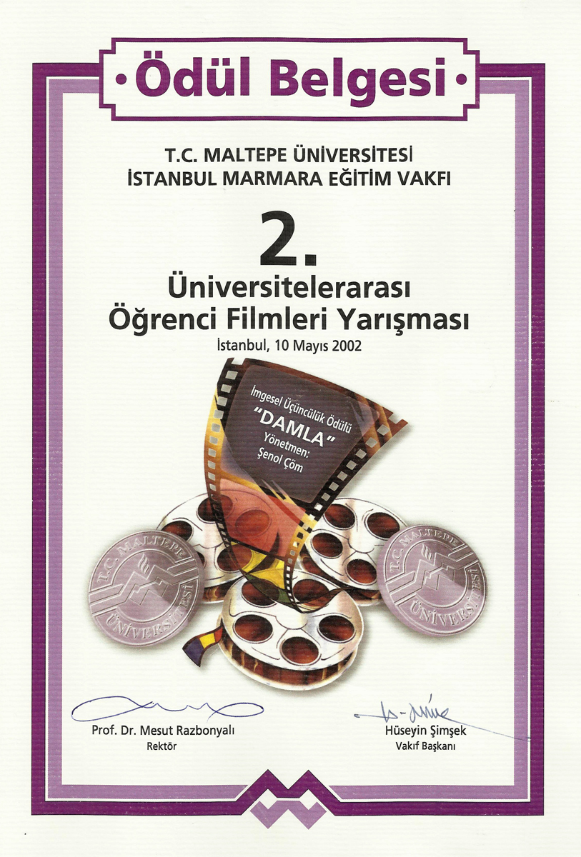 Maltepe Üniversitesi 1. Film Festivali 3.lük ödülü (Damla) (Ödül Belgesi)