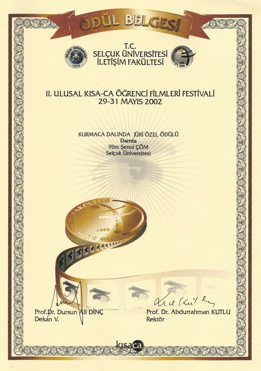 S.Ü. 2. Kısa-ca Film Festivali Jüri Özel Ödülü ( Damla ) (Ödül Belgesi)