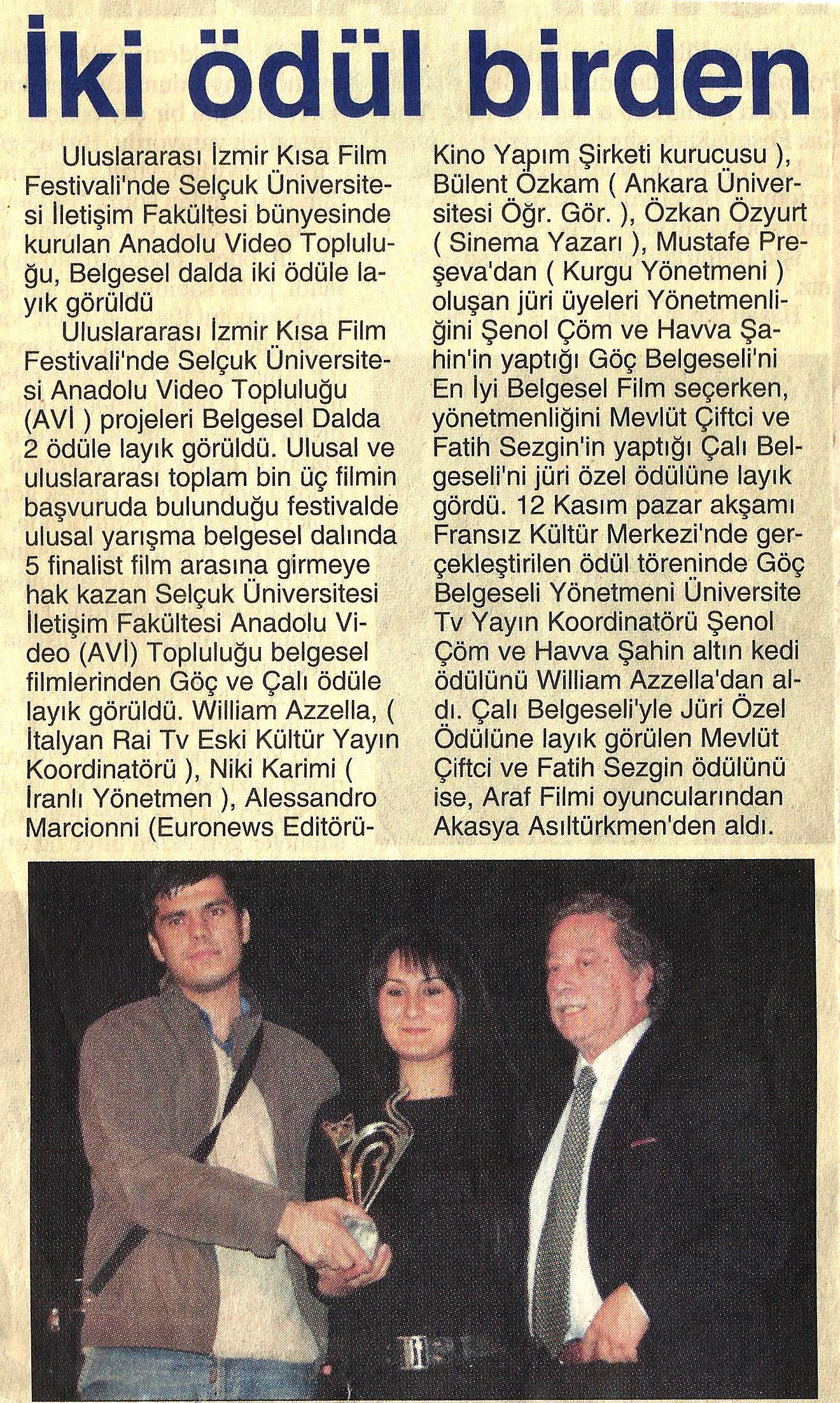 7. Uluslararası İzmir Kısa Film Festivali En İyi Belgesel Ödülü ( Göç ) (Kameraarkasi.org) (Gazete Küpür)