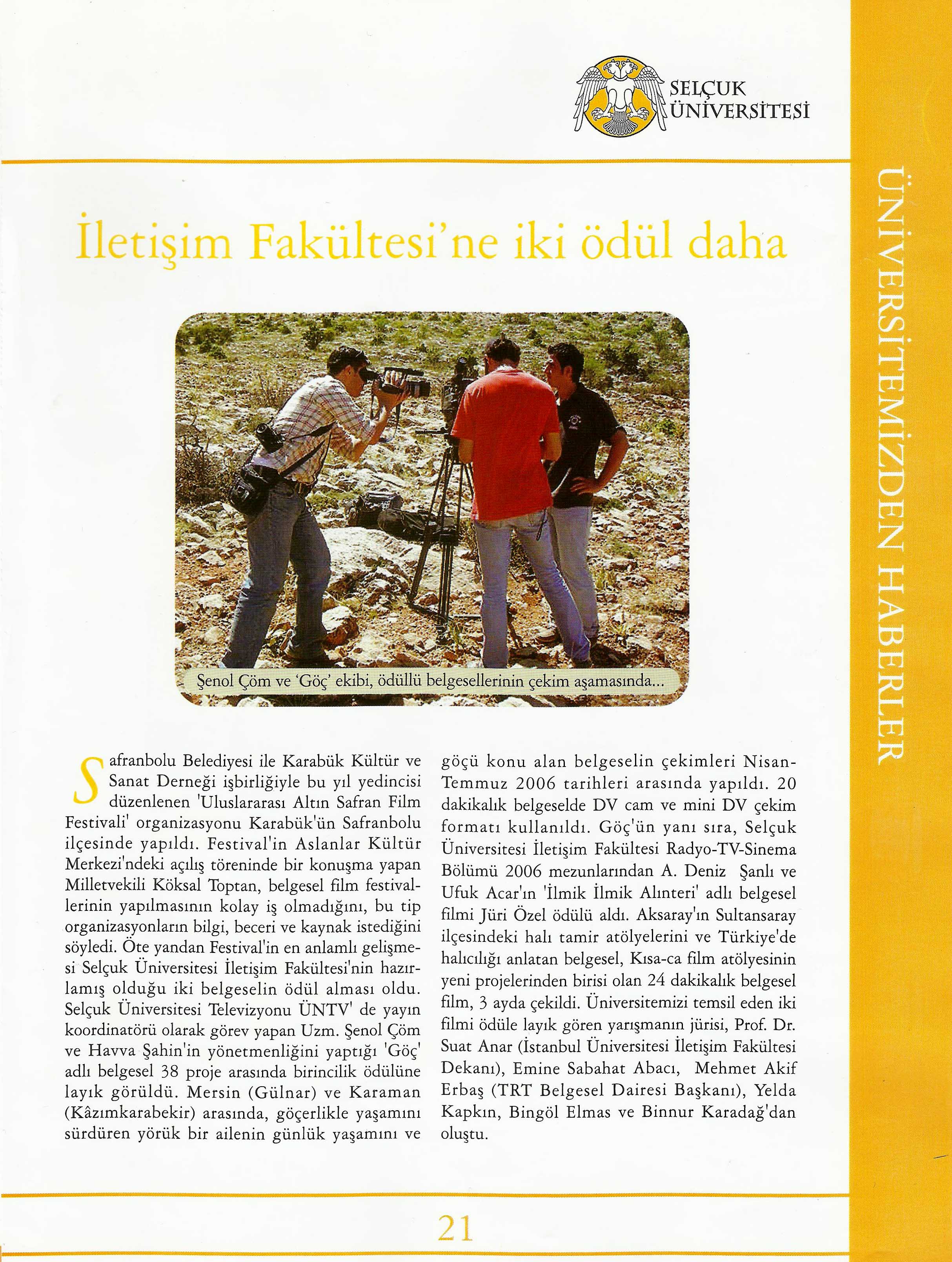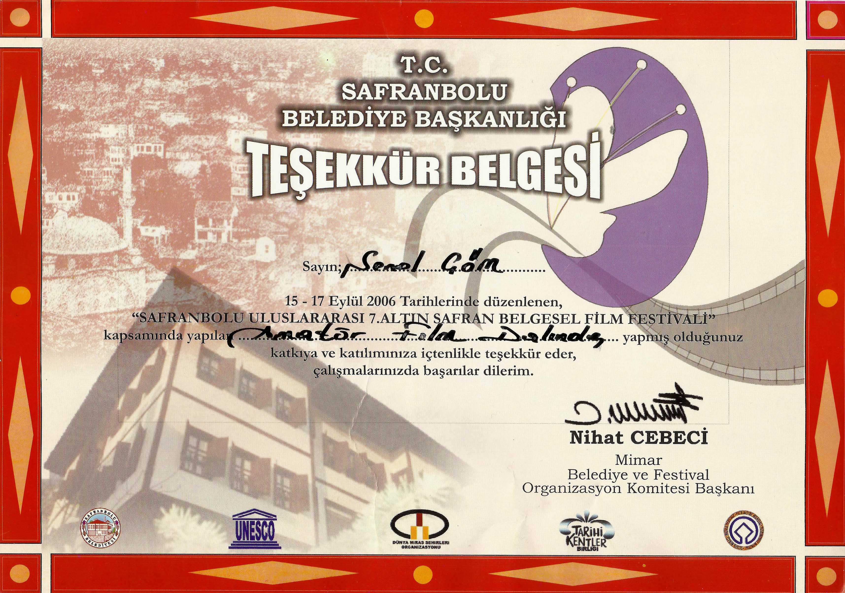 7. Uluslararası Altınsafran Belgesel Film Festivali 1. lik ödülü ( Göç ) (Katılım Belgesi) (Gazete Haber) (Selçuk Bakış)