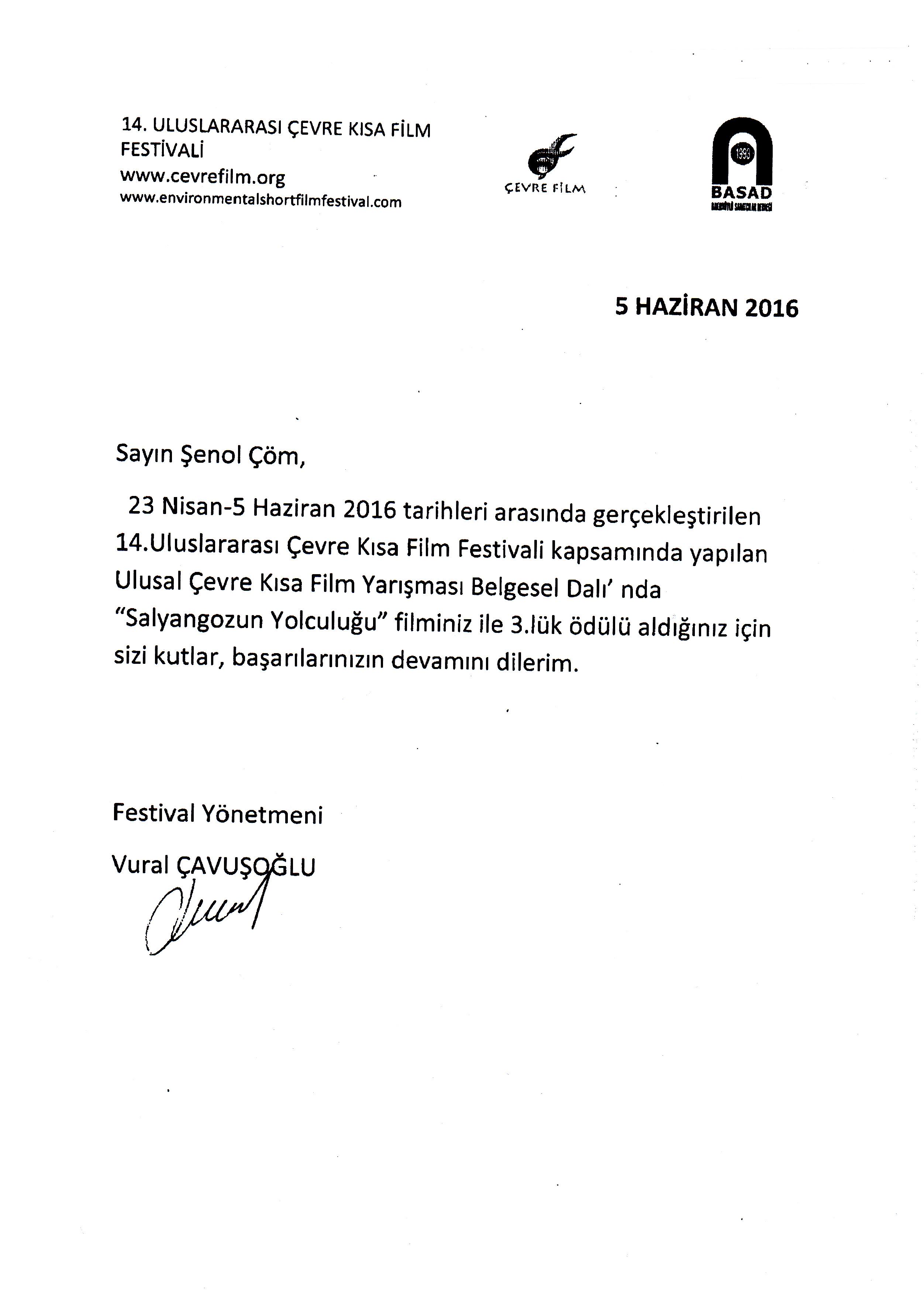 14. Uluslararası Çevre Film Festivali Belgesel Kategori 3. lük ödülü Ayrıntı (Ödül Belgesi) (Katılım Belgesi) filmarasidergisi ..sinemafilm.net