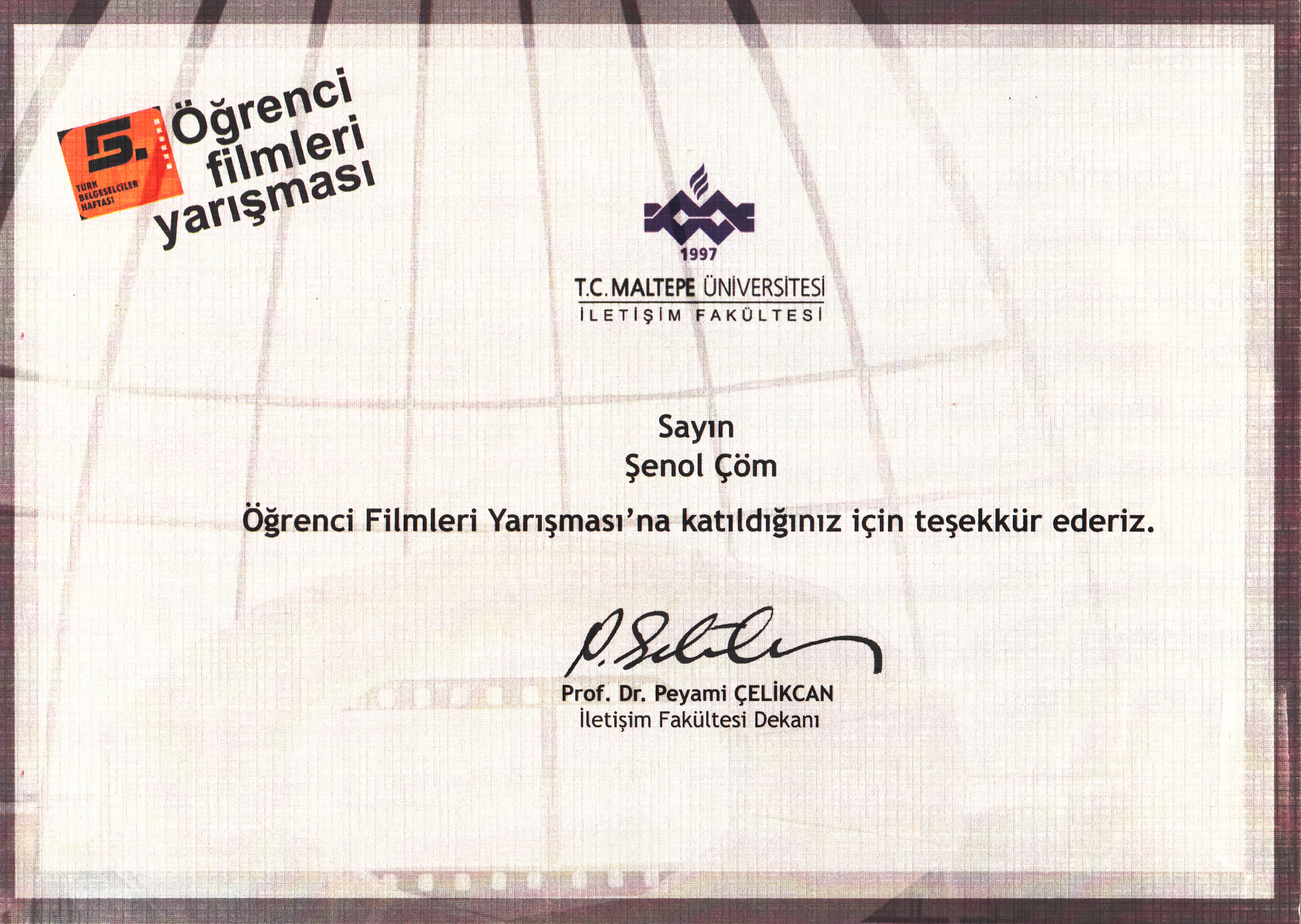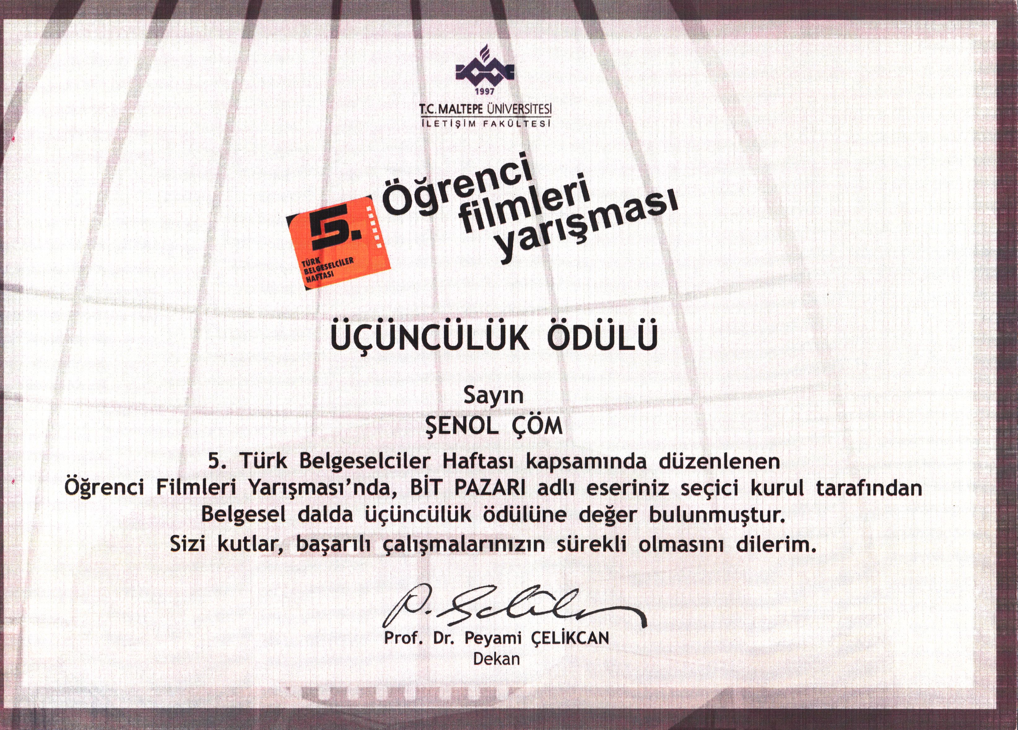 Maltepe Üniversitesi 5. Öğrenci Filmleri Festivali 3. lük ödülü.( Bit Pazarı ) (Ödül Belgesi)