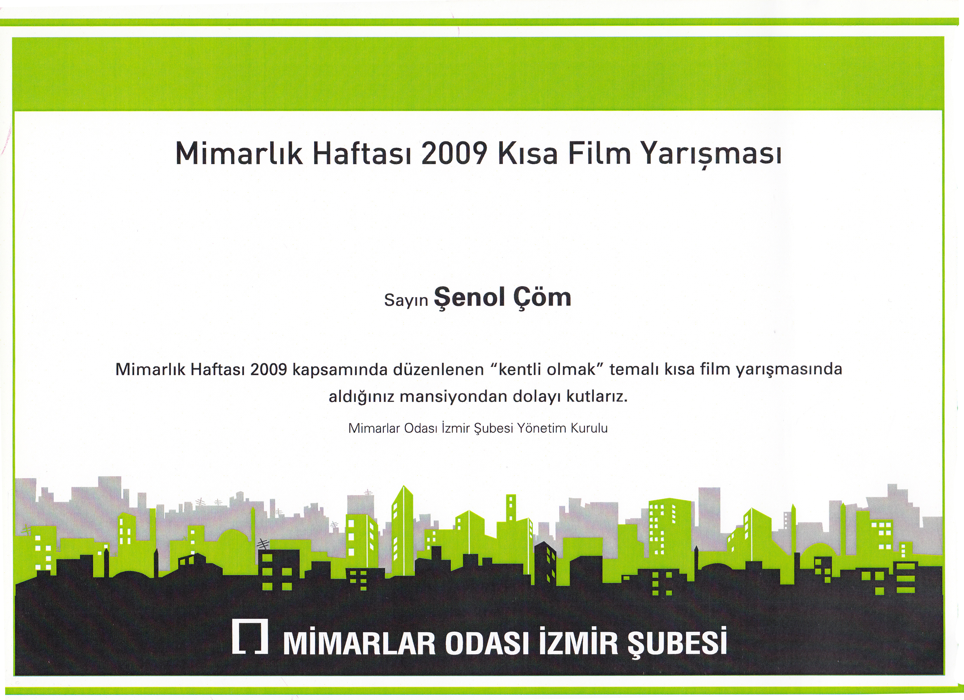 Kentli Olmak Kısa Film Yarışması Mansiyon (Ödül Belgesi) (mimarizm.com) (yapi.com.tr)