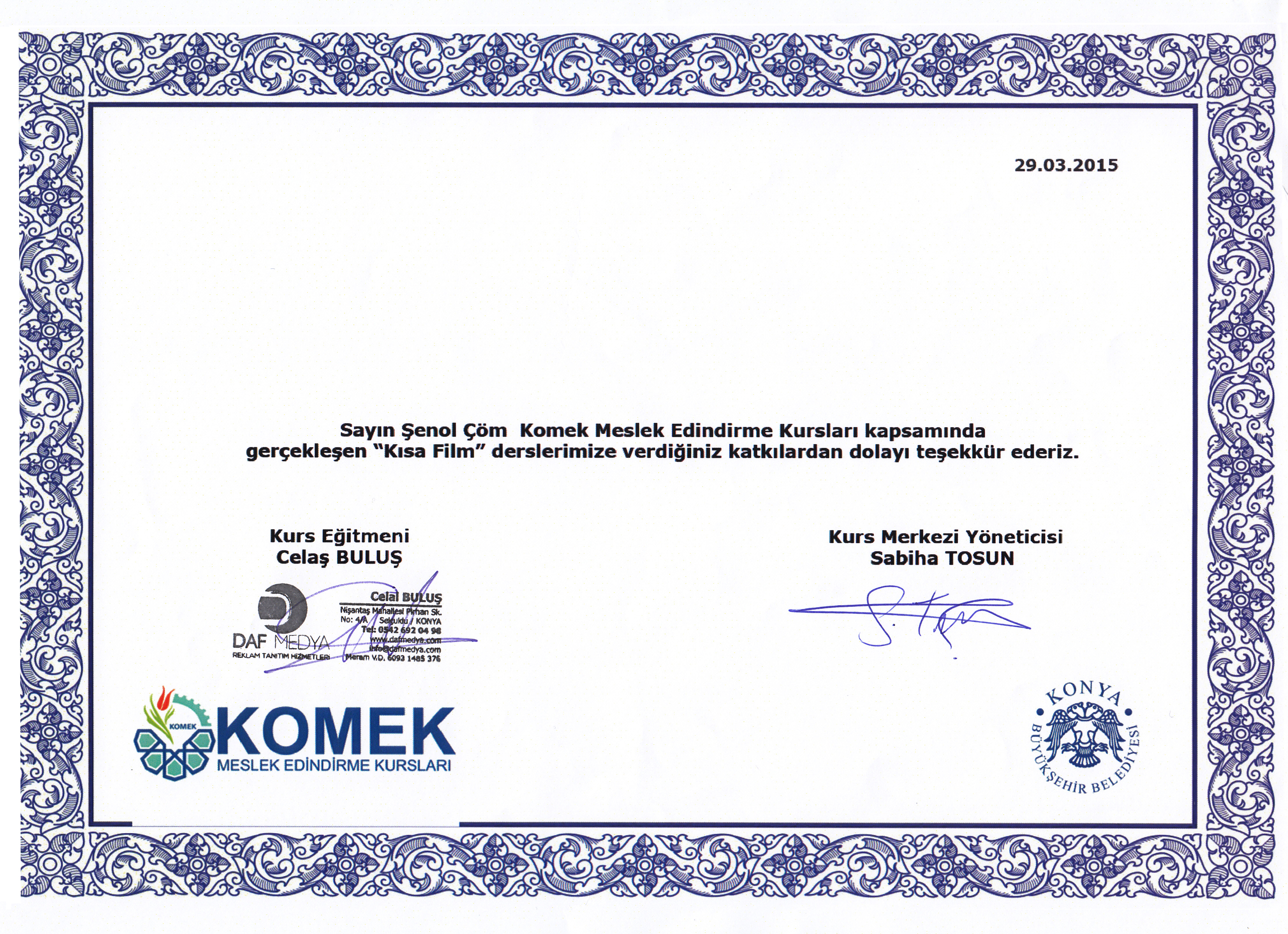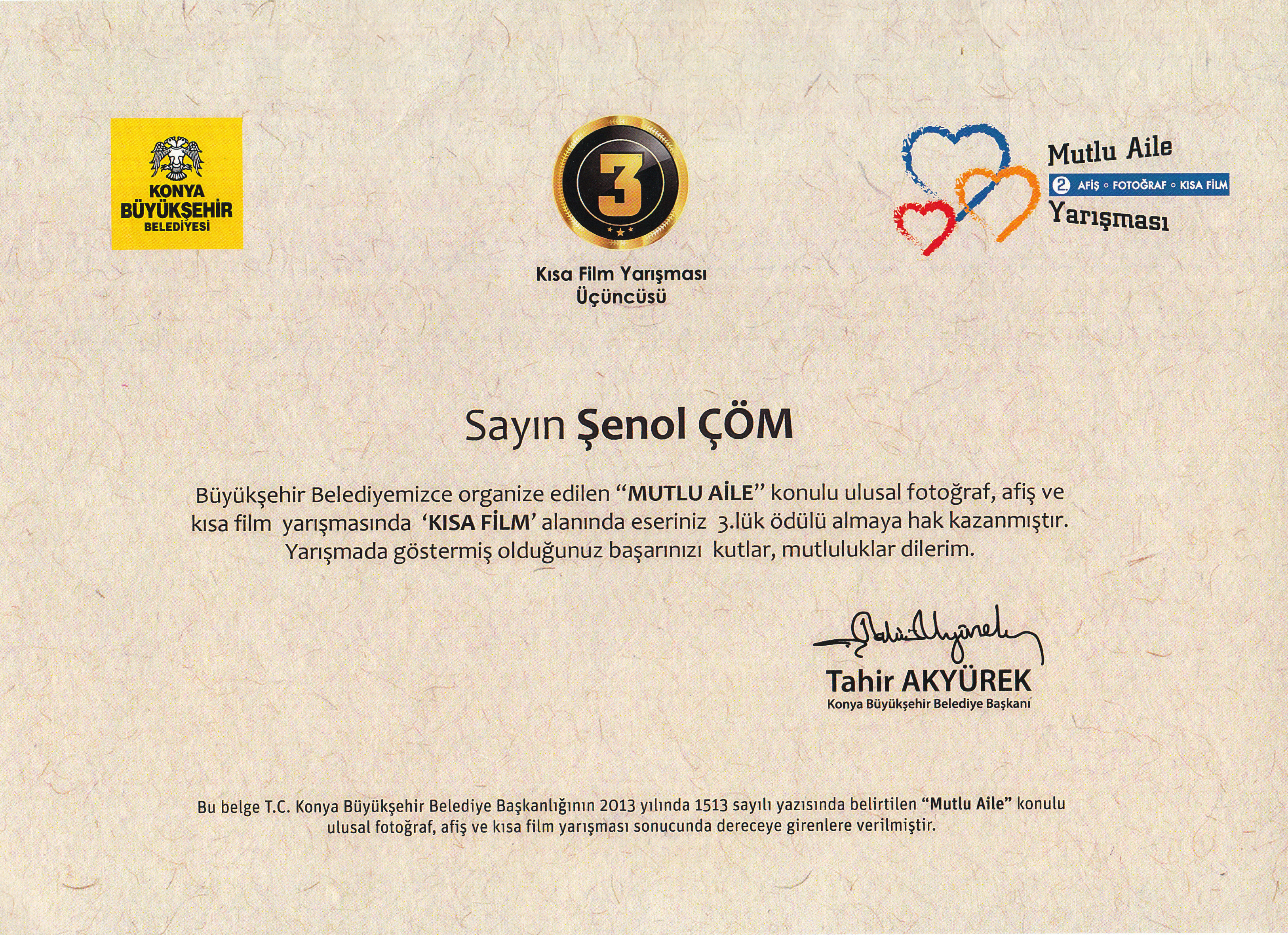 Konya Büyükşehir Belediyesi (Mutlu Aile) 2. Kısa Film Yarışması 3.lük ödülü Ayrıntı (Ödül Belgesi) (Katalog) (beyazgazete) (konya bld) (sondakika) (haberfark)