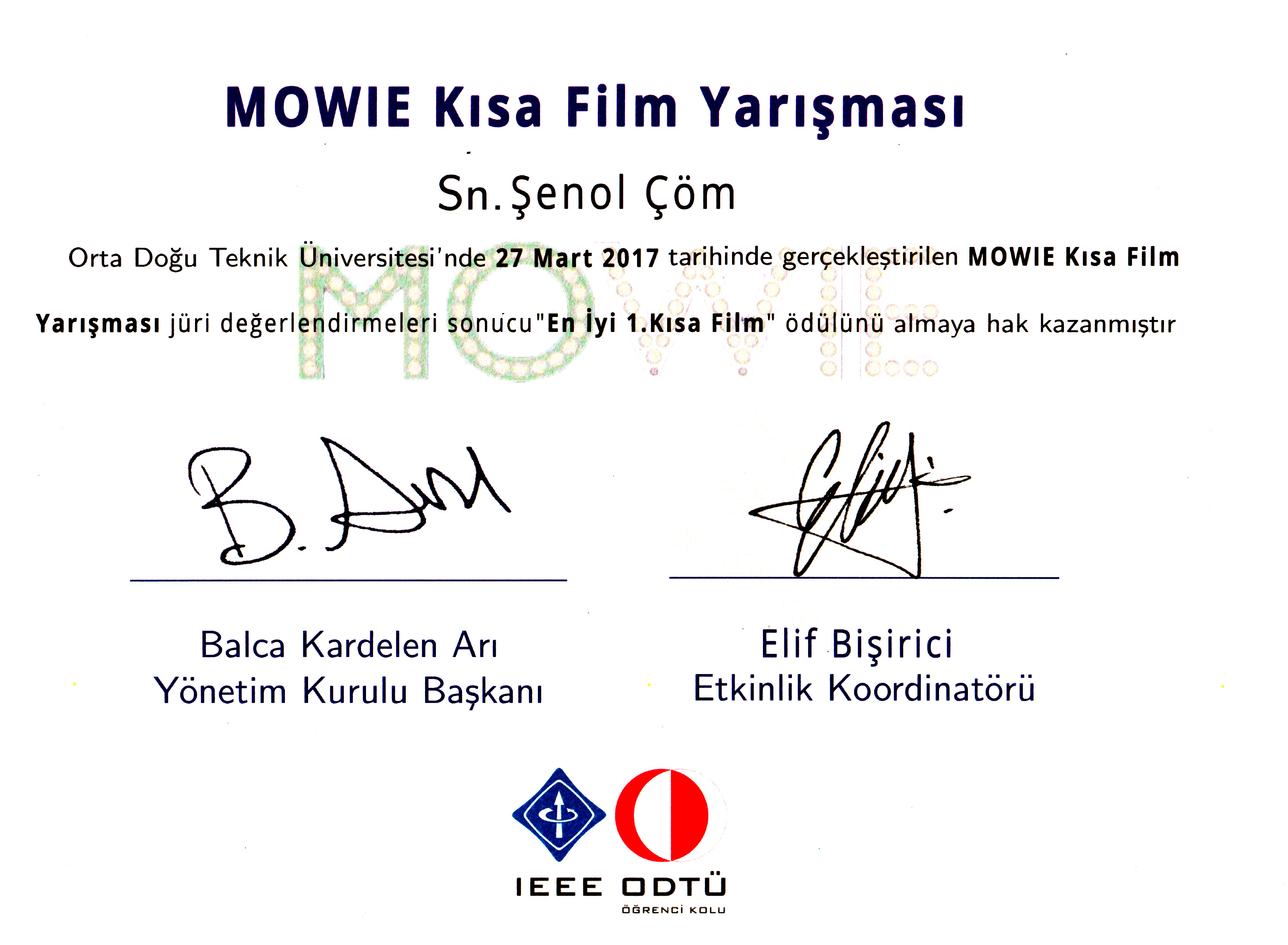 IEEE ODTÜ Women in Engineering 2. MOWIE yarışması 1.lik ödülü Ayrıntı (Ödül Belgesi) (Movie Facebook)