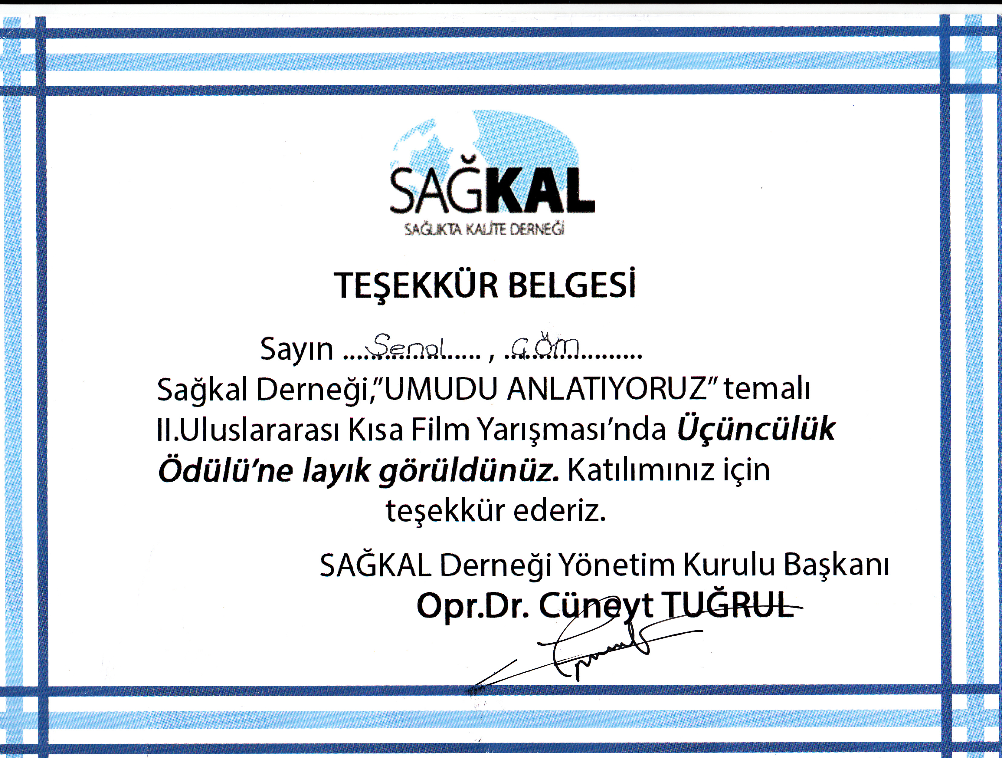 Sağkal Derneği Umudu Anlatıyoruz Yarışması 3. lük ödülü Ayrıntı (Ödül Belgesi)