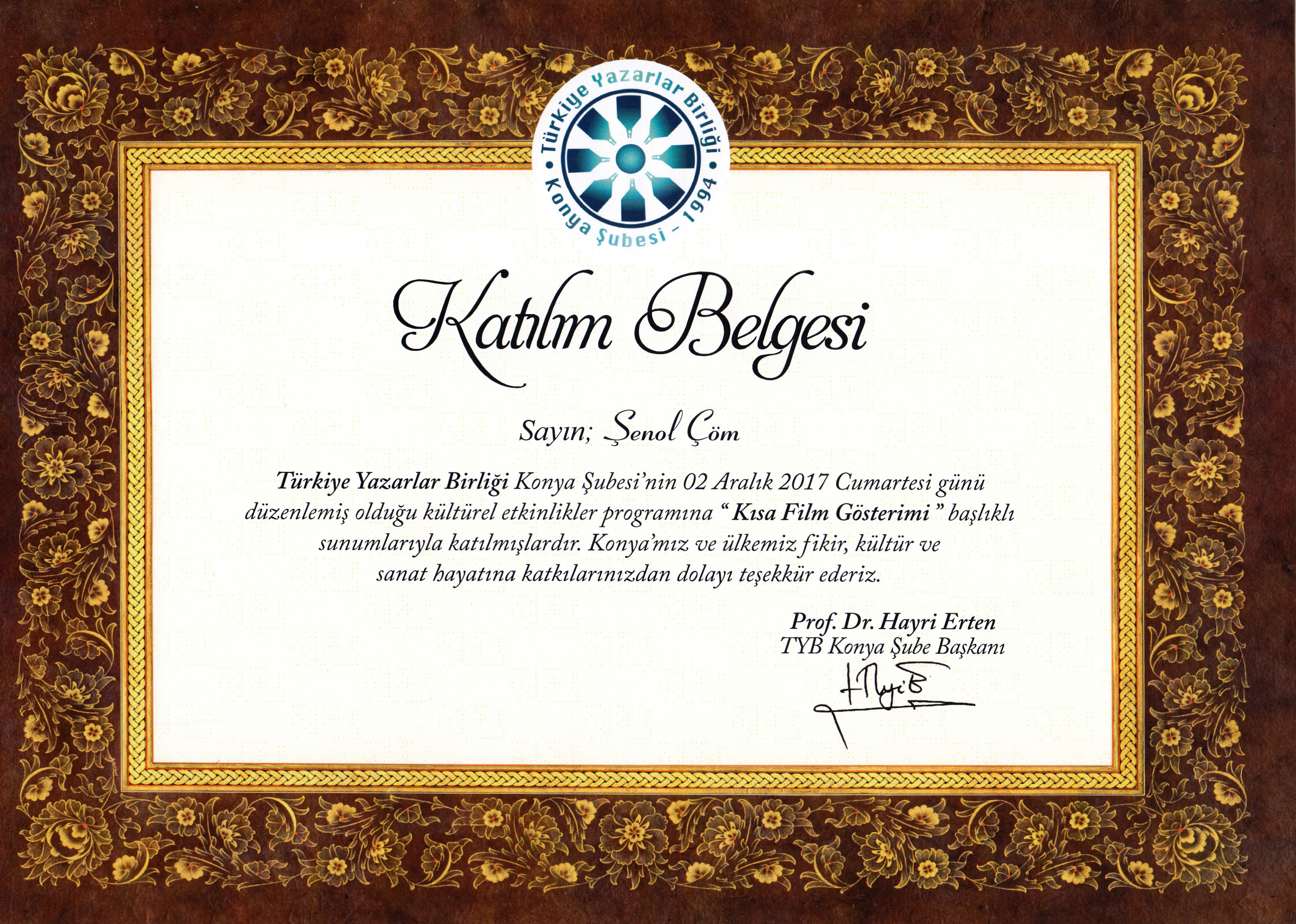 Yazarlar Birliği Konya Şubesi Kısa Film Gösterimi ve Söyleşisi (2017) (Katılım Belgesi)